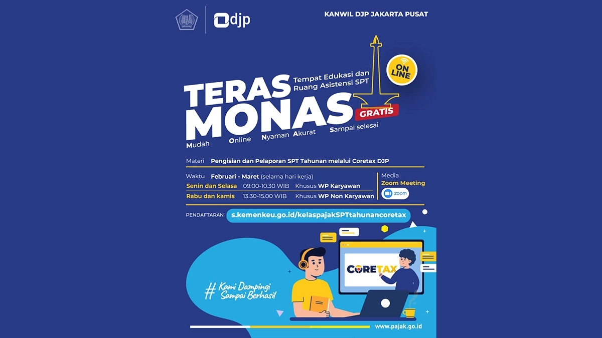 Teras Monas diselenggarakan secara elektronik melalui Zoom setiap hari kerja pada Februari hingga Maret 2026. Wajib pajak bisa memperoleh edukasi dan pendampingan terkait pelaporan SPT Tahunan melalui Teras Monas tanpa dipungut biaya.