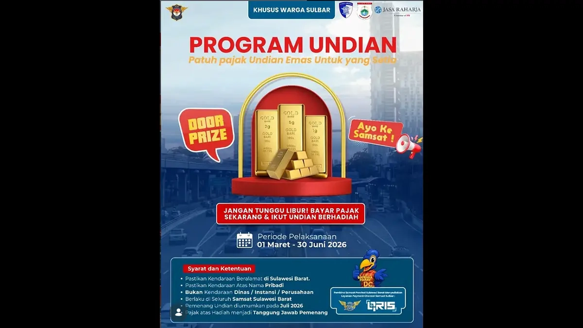 Lalu, bukan kendaraan dinas atau instansi atau perusahaan, dan program undian berlaku di seluruh kantor Samsat di Sulbar. Selanjutnya, pemenang undian akan diumumkan pada Juli 2026, dan pajak atas hadiah menjadi tanggung jawab masing-masing pemenang.