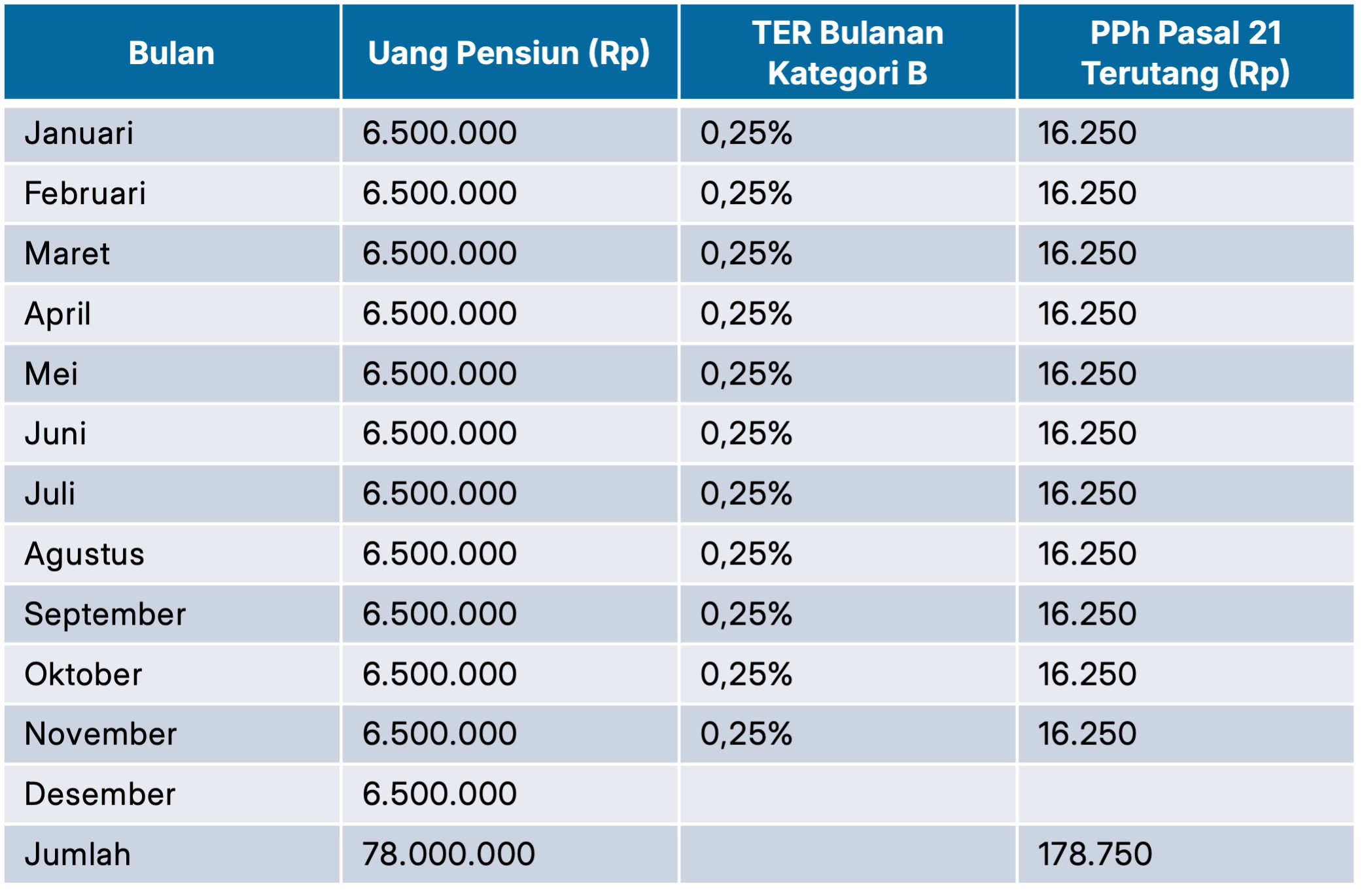 Penghitungan PPh Pasal 21 terutang atas uang pensiun selama tahun 2024 sebagai berikut: