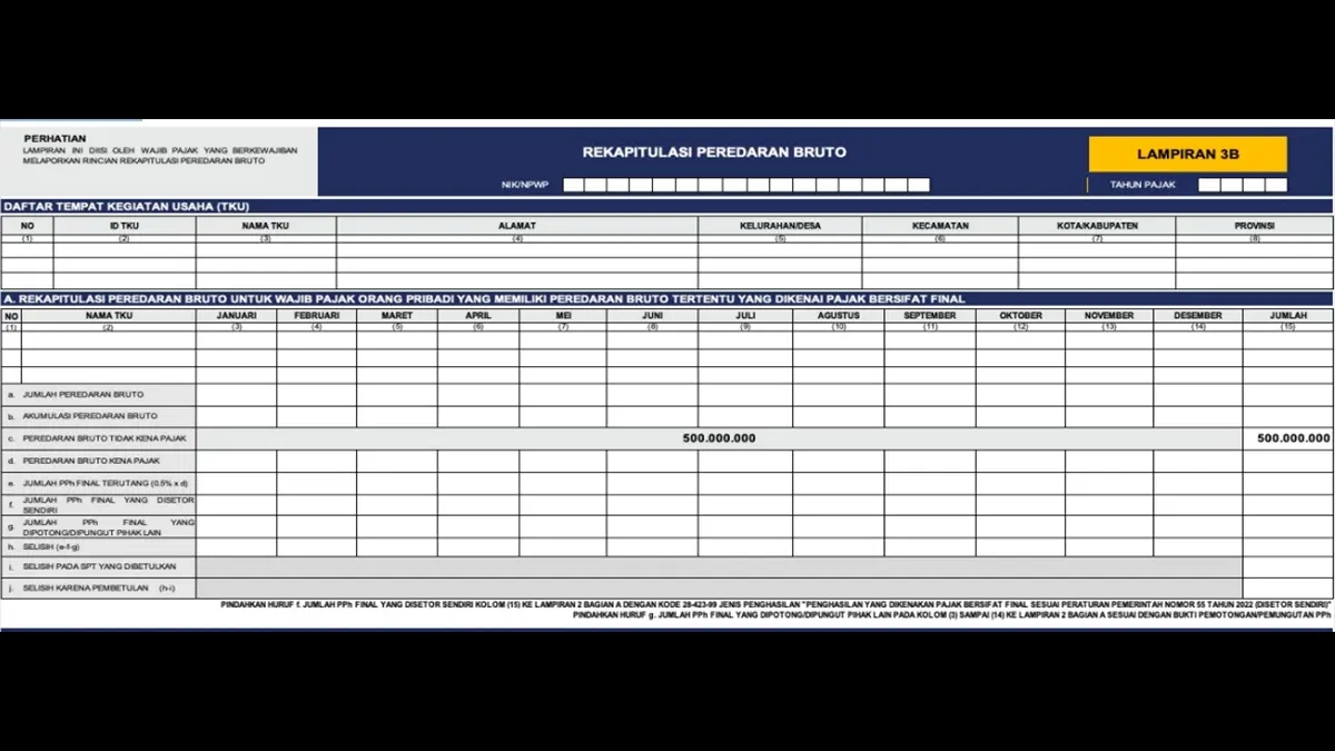 Bila nilai akumulasi omzet pada baris b belum melebihi Rp500 juta, peredaran bruto kena pajak pada baris d diisi 0. Bila nilai akumulasi omzet pada baris b sudah melebihi Rp500 juta, peredaran bruto kena pajak pada baris d setiap bulannya diisi dengan hasil penghitungan dari nilai pada baris b bulan bersangkutan, dikurangi omzet tidak kena pajak Rp500 juta, dikurangi nilai pada baris d bulan sebelumnya.
