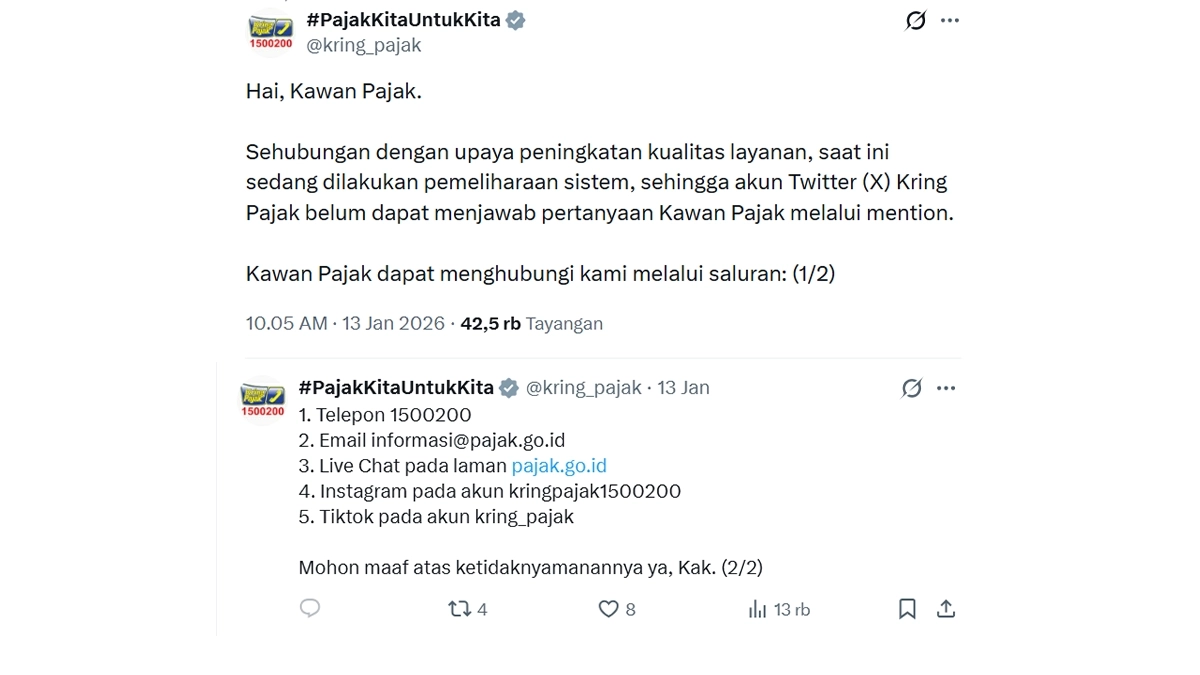 Rosmauli menjelaskan sejak 13 Januari 2026, kanal media sosial X @kring_pajak mengalami gangguan teknis sehingga tidak dapat memberikan respons menjawab mention pertanyaan perpajakan secara optimal.