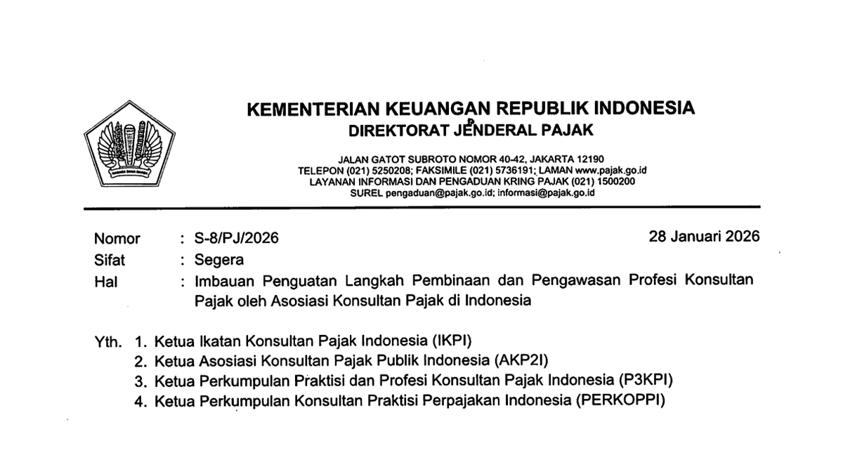 JAKARTA, DDTCNews - Dirjen Pajak Bimo Wijayanto menerbitkan surat resmi kepada 4 asosiasi konsultan pajak di Indonesia. Surat Dirjen Pajak bernomor S-8/PJ/2026 ini berisi tentang 'Imbauan Penguatan Langkah Pembinaan dan Pengawasan Profesi Konsultan Pajak oleh Asosiasi Konsultan Pajak di Indonesia'.