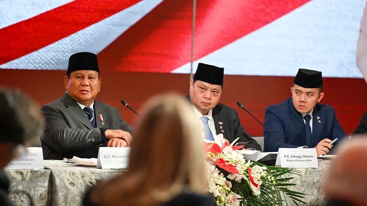 <p>Presiden Prabowo Subianto (kiri) didampingi Menko Perekonomian Airlangga Hartarto (tengah) dan Sekretaris Kabinet Teddy Indra Wijaya (kanan) saat menghadiri Bussines Summit di Washington DC, Amerika Serikat, Rabu (18/2/2026). ANTARA FOTO/Hafidz Mubarak A/rwa.</p>