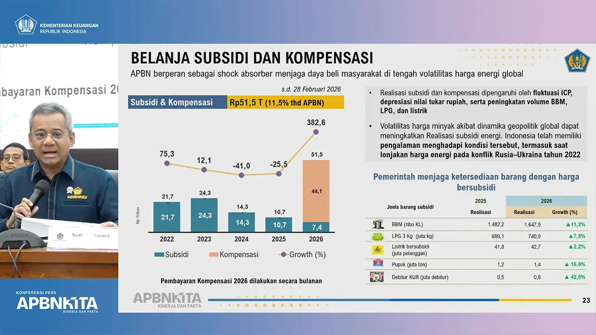 "Kalau dilihat belanja subsidi dan kompensasi meningkat di awal 2026. Tahun 2025 itu pure hanya subsidi yang sifatnya bulanan, kalau tahun 2026 baik pembayaran subsidi bulanan kepada PLN dan Pertamina, juga ada pembayaran kompensasi untuk utang kompensasi tahun lalu," ujarnya, dikutip pada Kamis (12/3/2026).