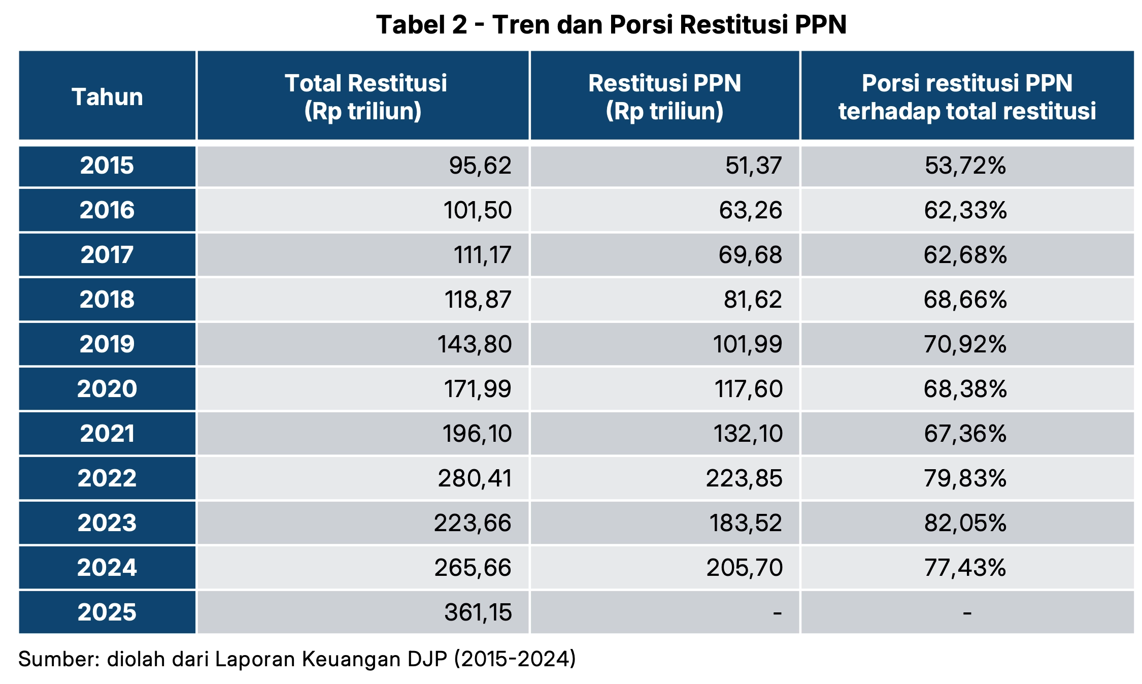 Dalam 1 dekade terakhir, restitusi pajak di Indonesia mengalami peningkatan signifikan. Hal ini mencerminkan sejumlah faktor, antara lain dinamika perekonomian domestik, kondisi dunia usaha, fluktuasi harga komoditas, serta perubahan kebijakan fiskal dan tata laksana administrasi perpajakan.