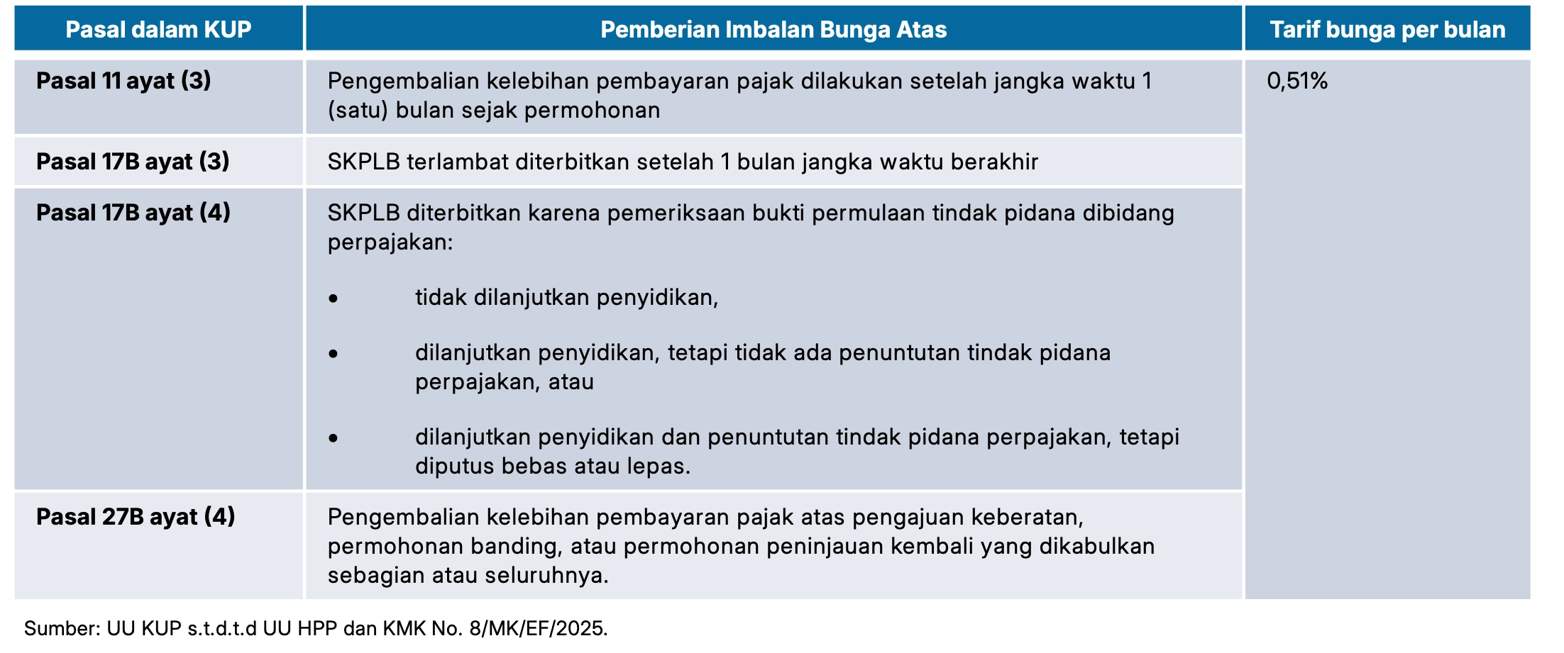 Sementara itu, tarif bunga per bulan sebagai dasar pemberian imbalan bunga ditetapkan sebesar 0,51%. Tarif bunga per bulan tersebut lebih rendah dibandingkan dengan periode sebelumnya. Perincian tarif per bulan atas imbalan bunga pajak periode periode 1–30 November 2025 dapat dilihat pada tabel berikut: