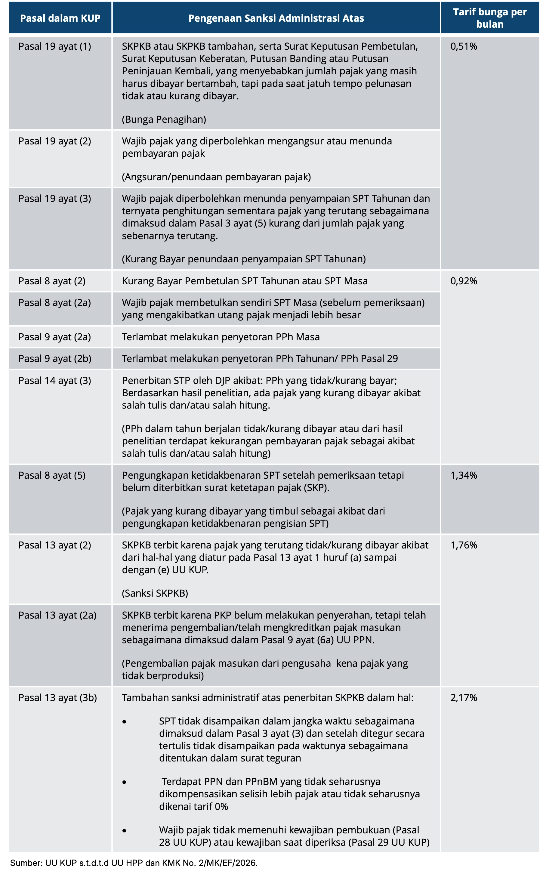 Terdapat 5 tarif bunga per bulan untuk sanksi administrasi, yaitu mulai dari 0,51% sampai dengan 2,17%. Tarif tersebut lebih rendah dibandingkan dengan tarif sanksi bunga yang berlaku pada periode Januari 2026.