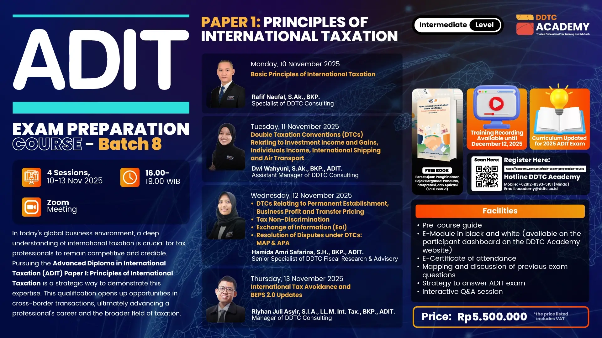 Pada batch ini, DDTC Academy menghadirkan materi pelatihan yang telah disesuaikan dengan silabus ujian ADIT 2025. Selain membahas konsep dan ketentuan yang relevan, pemateri juga akan memberikan pemetaan soal-soal ujian ADIT dari tahun-tahun sebelumnya.