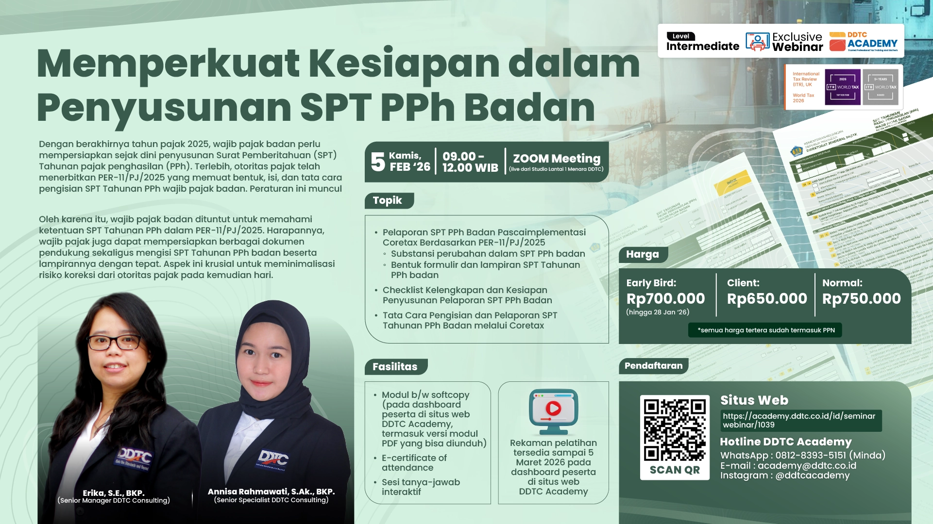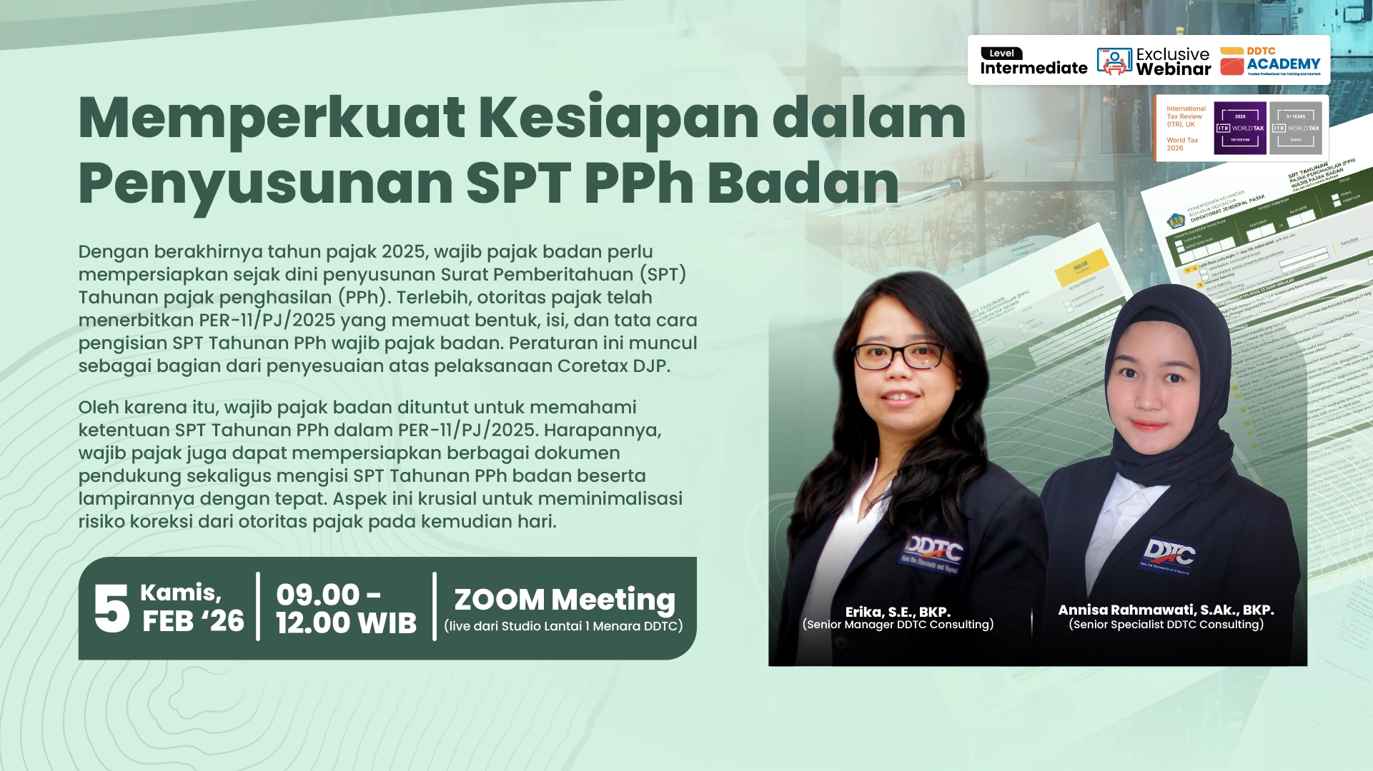 Dengan adanya urgensi tersebut, DDTC Academy menghadirkan exclusive webinar bertajuk Memperkuat Kesiapan dalam Penyusunan SPT PPh Badan. Acara ini akan digelar pada, 5 Februari 2026 pukul 09.00-12.00 WIB secara online melalui Zoom (live dari studio lantai 1 Menara DDTC).