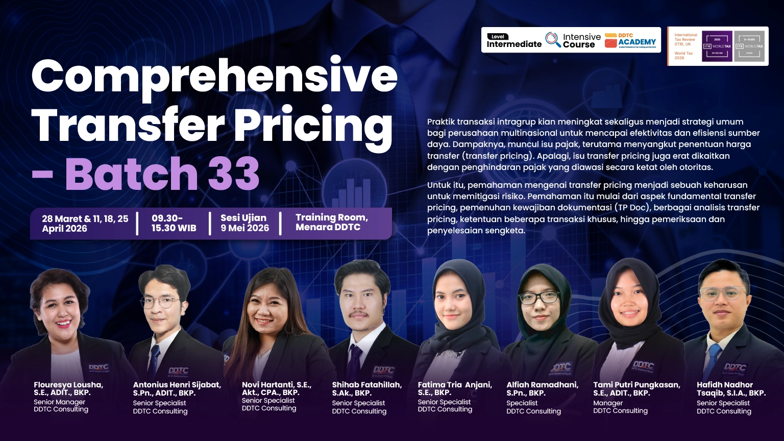 Selain itu, pembahasan terkait pemeriksaan serta tata cara penyelesaian sengketa transfer pricing turut diulas. Course ini dilaksanakan dalam 4 sesi pertemuan (setiap Sabtu pada 28 Maret–25 April 2026, pukul 09.30–15.30 WIB) serta 1 sesi ujian akhir (Sabtu, 9 Mei 2026, pukul 09.00-12.00 WIB).