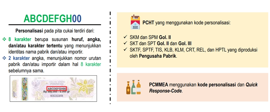 Sesuai dengan namanya, kode tersebut bersifat personal untuk setiap perusahaan. Contoh, pita cukai dengan personalisasi A khusus dicetak untuk perusahaan A. Sementara itu, pita cukai dengan personalisasi B khusus dicetak untuk perusahaan B dan seterusnya. (rig)