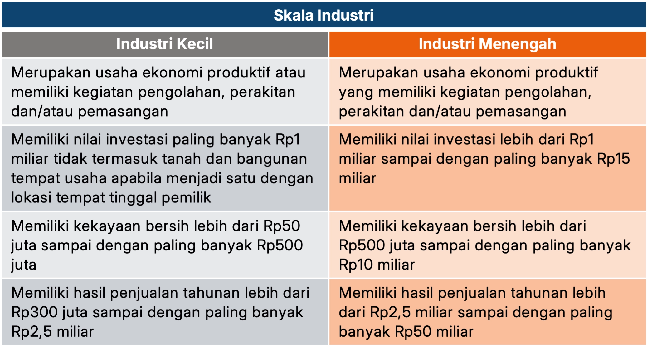 Nilai investasi berarti nilai tanah, bangunan, mesin peralatan, sarana, dan prasarana, kecuali modal kerja. Sementara itu, yang dimaksud dengan kekayaan bersih adalah pengurangan total nilai kekayaan usaha (aset) -tidak termasuk tanah dan bangunan tempat usaha- dengan total nilai kewajiban.