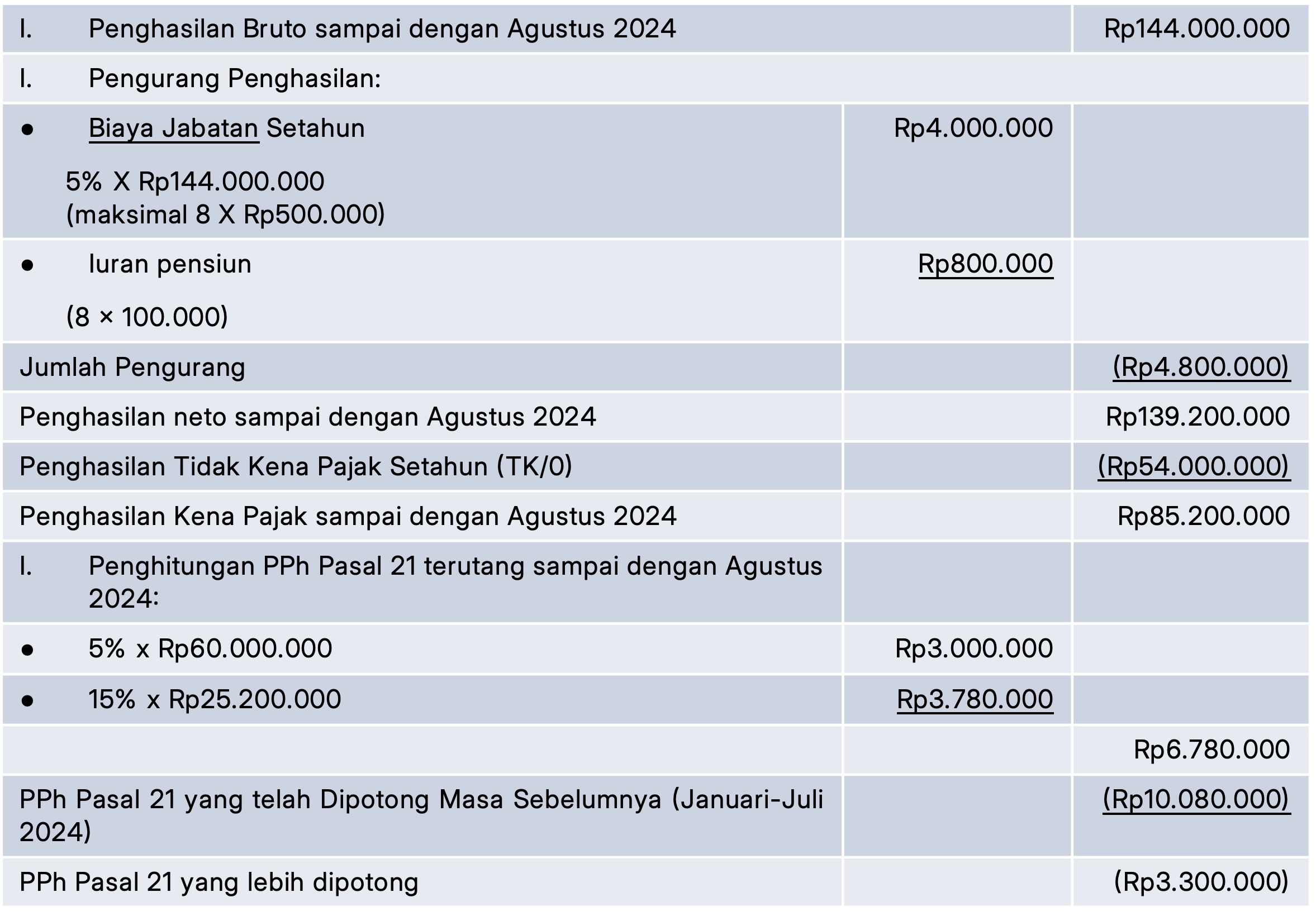 Mengingat Tuan Dandi terakhir bekerja di PT Z pada Agustus 2024 maka masa pajak tersebut merupakan masa pajak terakhir. Untuk itu, penghitungan PPh Pasal 21 terutang pada Agustus 2024 saat Tuan Dandi menggunakan formula penghitungan PPh Pasal 21 pada masa pajak terakhir:
