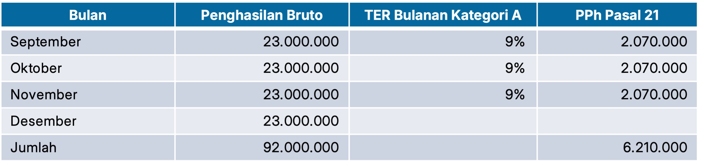 Melanjutkan contoh di atas, setelah berhenti bekerja pada PT Z, Tuan Dandi pindah bekerja pada PT XY sejak September 2024. Pada PT XY, Tuan Dandi menerima gaji senilai Rp23.000.000 per bulan. Tuan Dandi membayar iuran pensiun melalui PT XY senilai Rp100.000 per bulan.