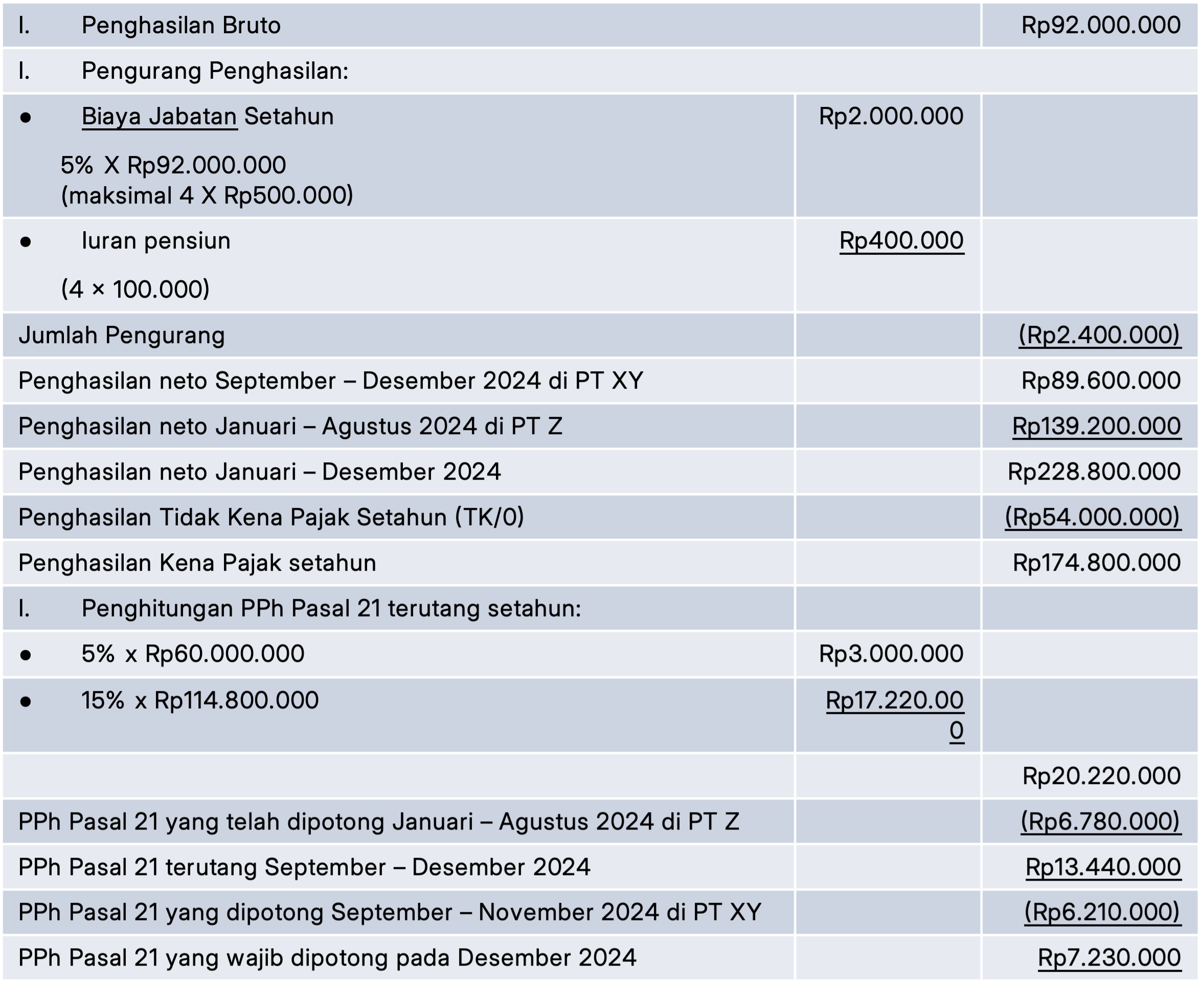 Apabila Tuan Dandi menyerahkan Bupot PPh Pasal 21 Formulir BPA1 dari PT Z ke PT XY maka penghitungan PPh Pasal 21 pada masa Desember 2024 adalah sebagai berikut: