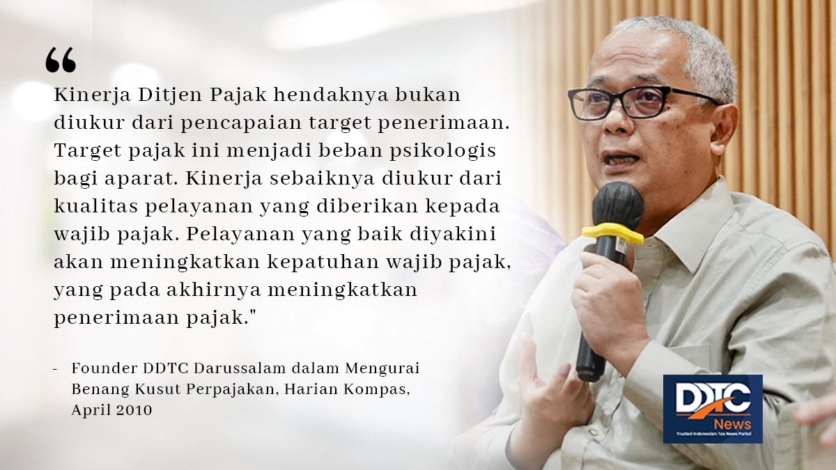 "Kinerja Ditjen Pajak hendaknya bukan diukur dari pencapaian target penerimaan. Target pajak ini menjadi beban psikologis bagi aparat. Kinerja sebaiknya diukur dari kualitas pelayanan yang diberikan kepada wajib pajak. Pelayanan yang baik diyakini akan meningkatkan kepatuhan wajib pajak, yang pada akhirnya meningkatkan penerimaan pajak."