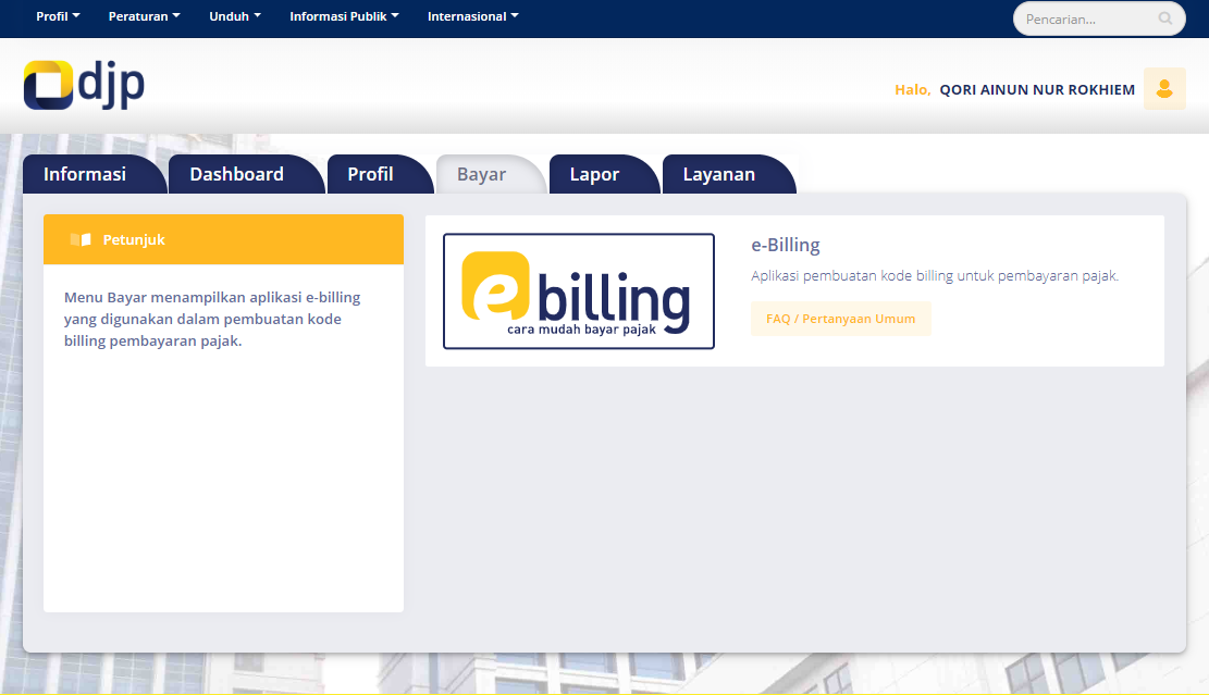 PERTAMA, silakan masuk DJP Online. Lalu isikan Nomor Pokok Wajib Pajak (NPWP), password dan captcha. Setelah itu klik Login. Nanti, Anda akan melihat beranda layanan Single Login. Setelah itu klik menu Bayar, dan klik e-billing.