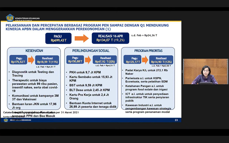 Menteri Keuangan Sri Mulyani Indrawati mengatakan realisasi tersebut setara 19,2% dari total pagu Rp699,43 triliun. Menurutnya, realisasi itu berasal dari berbagai klaster stimulus, mulai dari kesehatan, jaring pengaman sosial, hingga dukungan pemulihan dunia usaha.